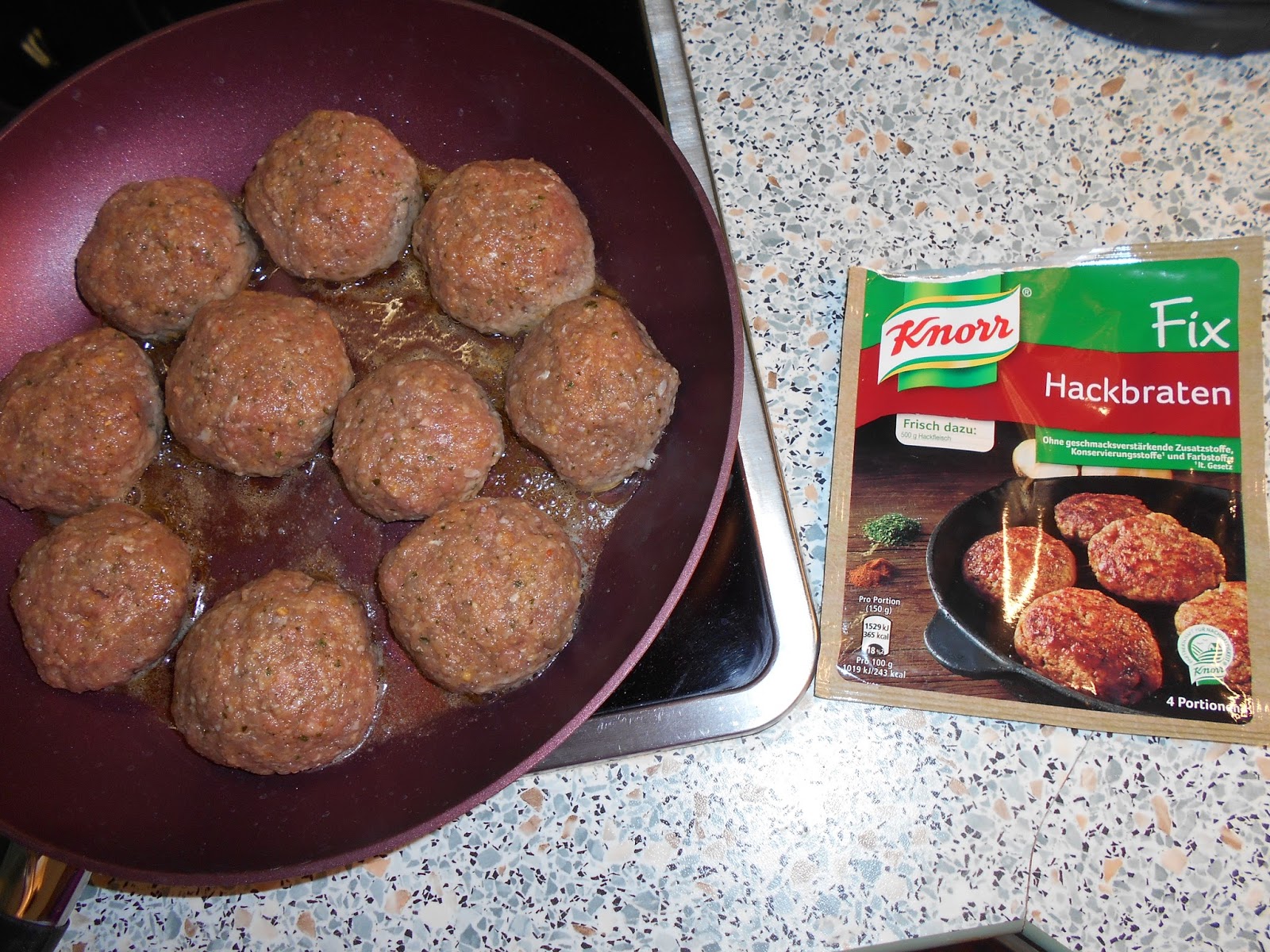 Für unser Abendbrot habe ich Klopse gebraten, dafür nehme ich immer diese Knorr-Tüte. Eigentlich bin ich gar kein Fan mehr davon, aber die Klopse schmecken mir so einfach besser.