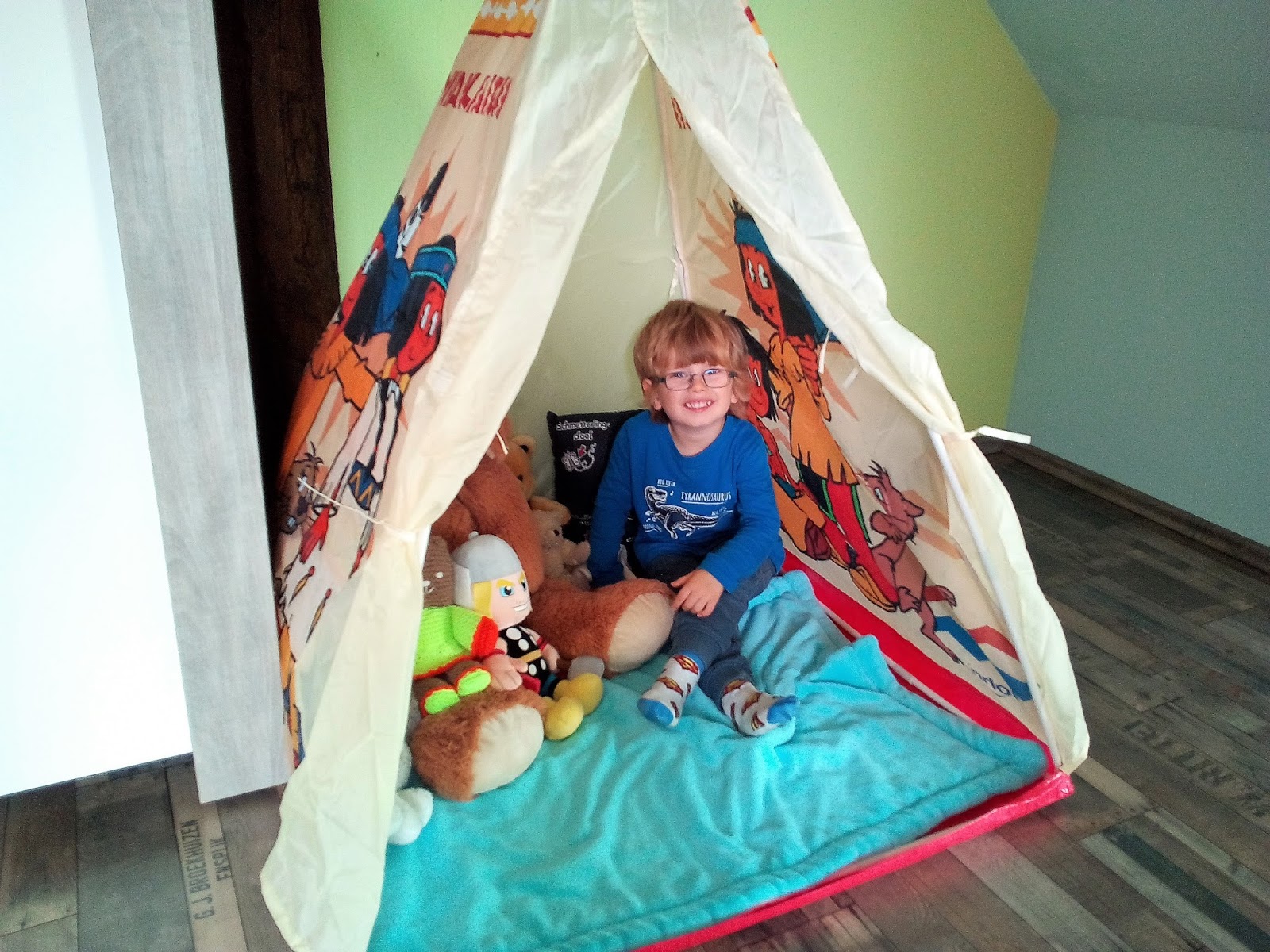 Von den Tageseltern hat Olli ein Zelt als Abschiedsgeschenk gekriegt. Er hatte schon eins im Zimmer, daher hatten wir das neue nicht aufgebaut. Nun ist leider eine Stange kaputt gegangen und da wurde es Zeit, das neue auszuprobieren. Mit ein wenig Hilfe von Olli habe ich das Zelt aufgebaut und wir haben alle Tiere und eine Decke reingelegt. Das Zelt sieht schöner aus, es ist heller und dadurch sieht es irgendwie größer aus. Olli hat sich sehr über sein neues Zelt gefreut.