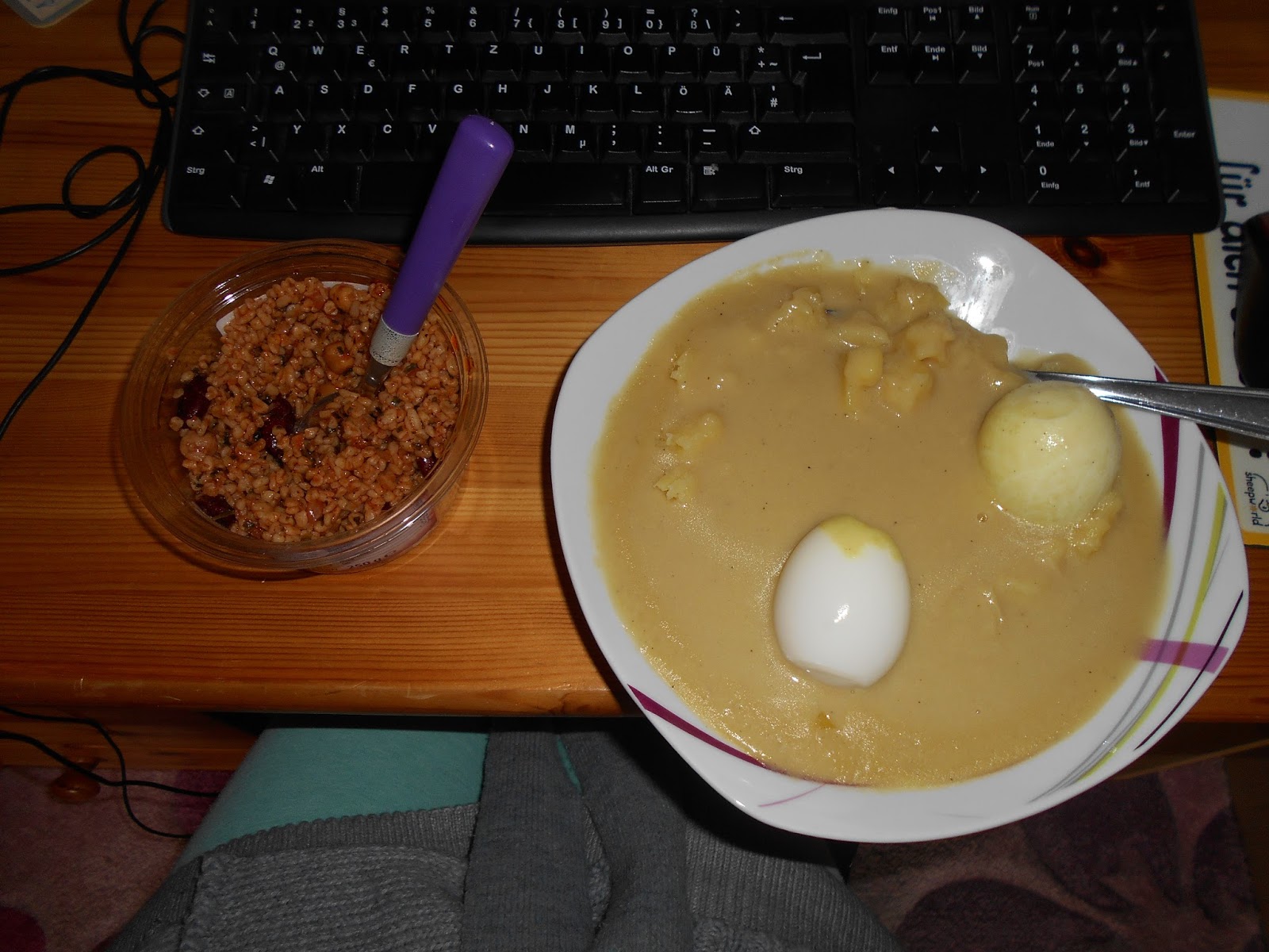 Mein Mittagessen von heute Mittag war mein Lieblingsessen. Es gab Senfei und zum Nachtisch Bulgursalat. Danach bin ich geplatzt. 🙂