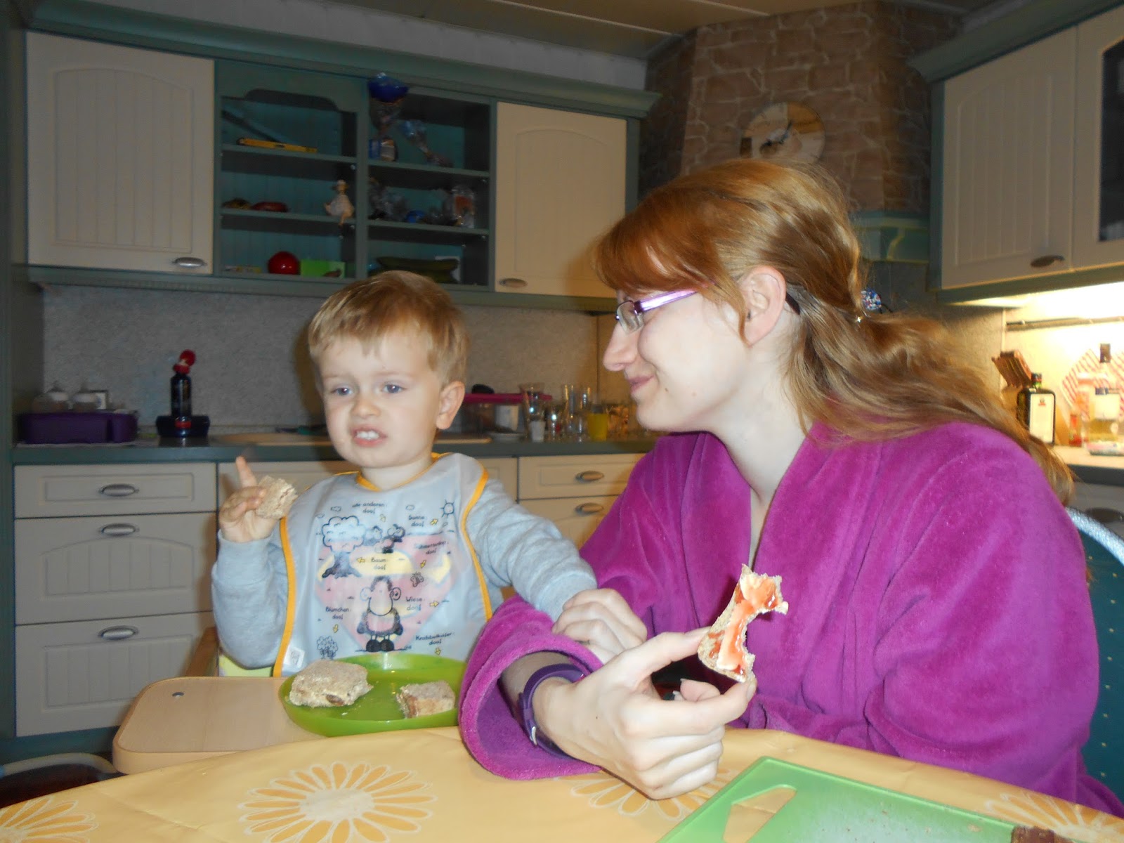 Die schönen Tage des Durchschlafens sind seit der Nacht zum Freitag wieder vorbei, das ist ja nicht so schlimm, schlimm ist, wenn er 07:08 sagt: „Ich muss eine Aa-Wurst.“ Jedem von uns ist klar, dass er nur pullern muss, aber na ja. Erste Diskussion: Olli will das Papa das macht, Papa will das Mama das macht und Mama sagt: „Nix ist, ich bin eh schon morgen dran.“ Danach hat André Olli nochmal in sein Bett gelegt, weil er bei uns immer so laut ist, somit können wir nochmal dösen. Etwas später stehe ich dann auf, ziehe Oliver schnell an und gehe schon mal die Katzen versorgen und bereite dann das Frühstück vor, damit wir kurz nach 8 Uhr dann essen können.