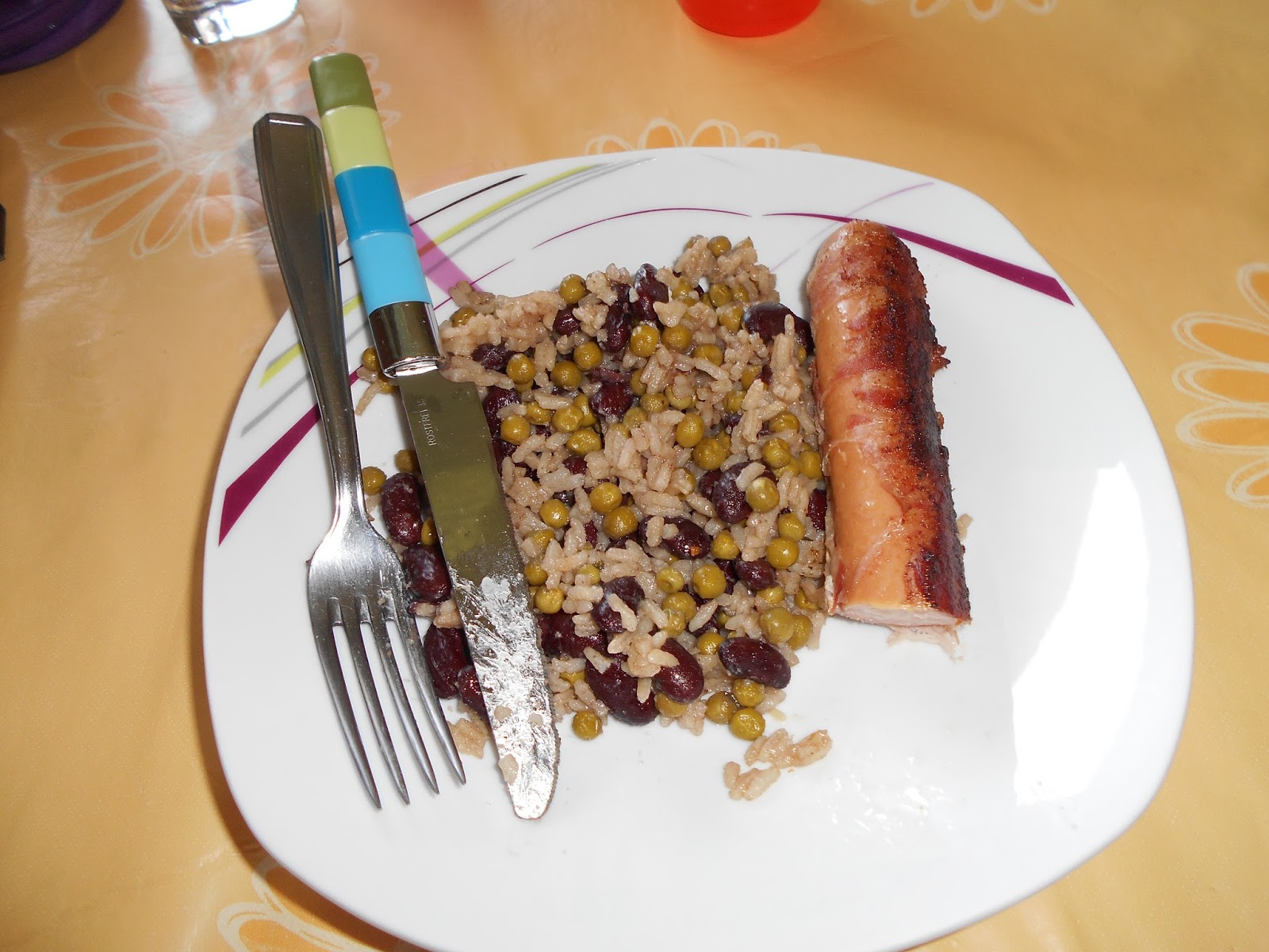 12:30 Uhr: Endlich gab es Mittagessen. Ich habe eine Reispfanne mit Bratwürsten und Berner Würsten gekocht.